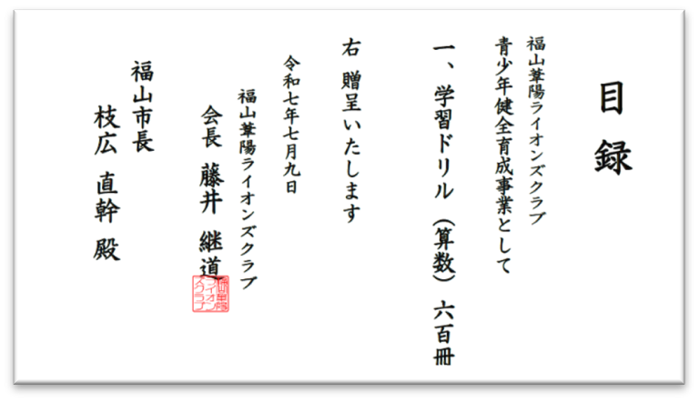 福山市役所にて、地域学習活動(小学校放課後チャレンジ教室)支援事業寄付受納式並びに感謝状贈呈式が執り行われました。
