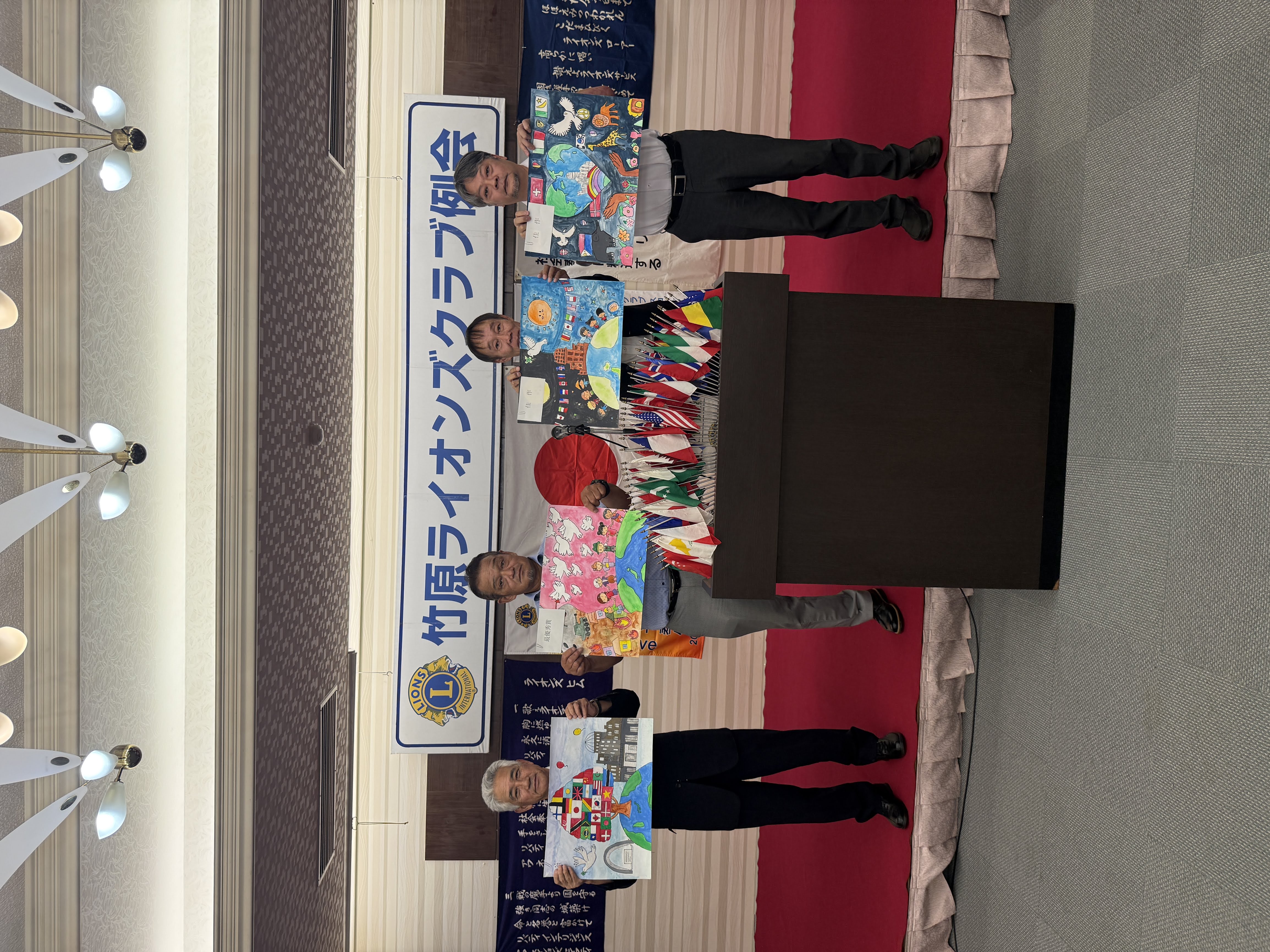 竹原ライオンズクラブの9月第2例会が開催されました。今回の例会では、恒例行事のひとつである「国際平和ポスターコンクール」の入賞作品の選定が行われました。本年度は、竹原小学校から34点、中通小学校から16点、東野小学校から2点、合計52点もの応募があり、子どもたちの豊かな感性と平和への思いが込められた作品が会場を彩りました。