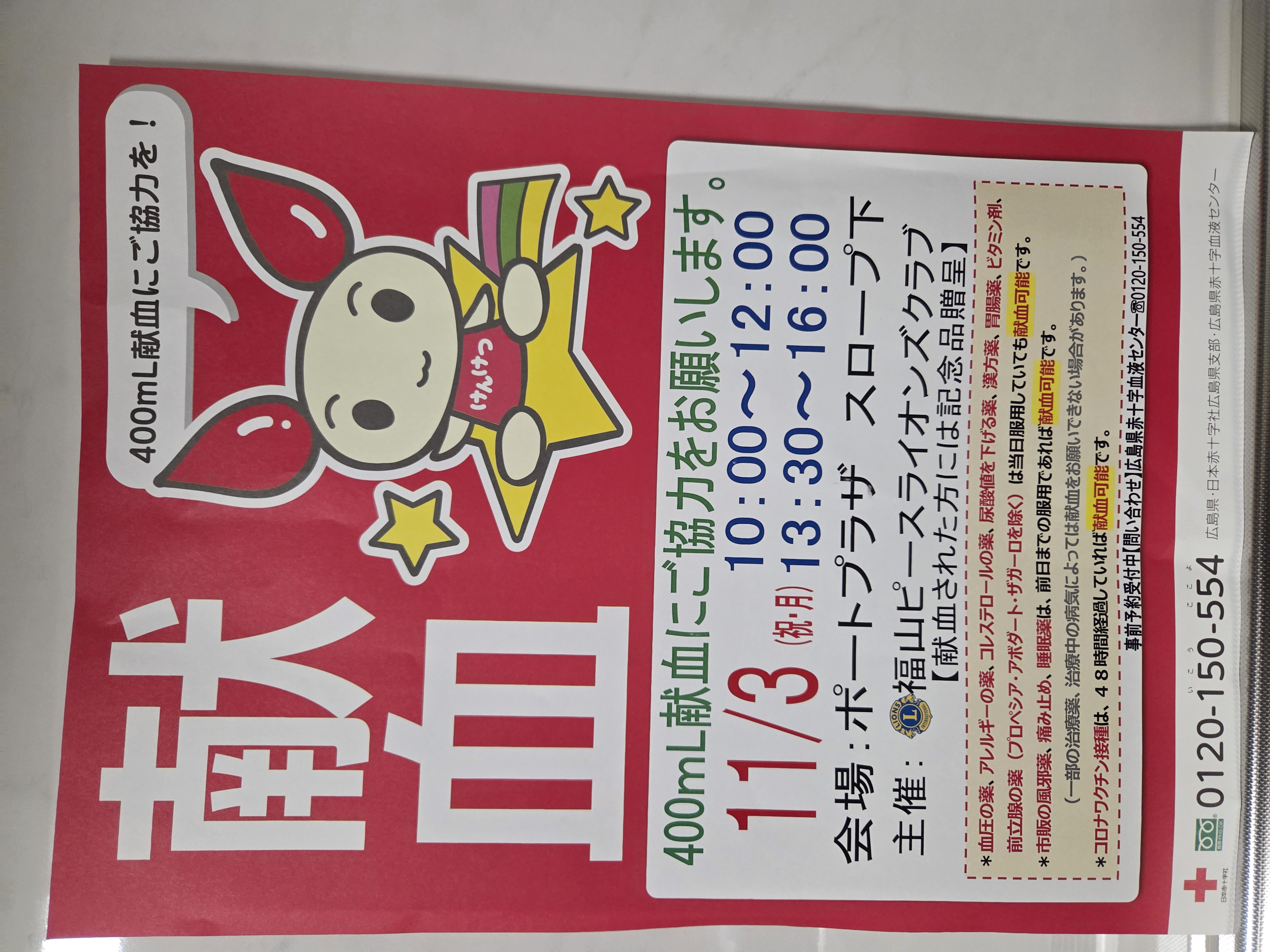 福山ピースライオンズクラブ会員一同は、来る11月3日に予定している献血活動の目標達成に向け、士気を高めました。