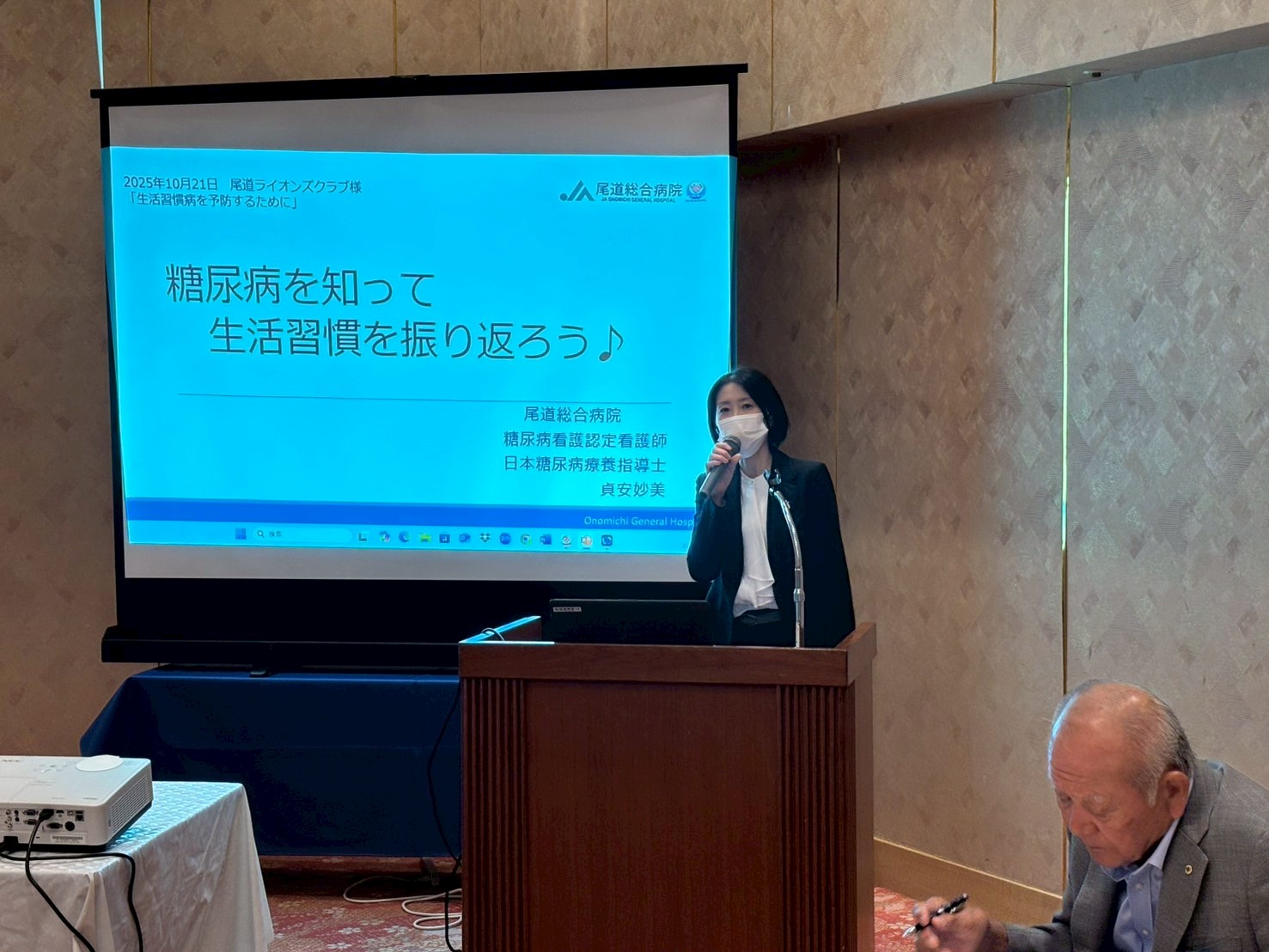 JA尾道総合病院認定講師・貞安妙美様をゲストにお招きし「生活習慣病を予防するために」という演題で講演していただきました。貞安様は糖尿病看護認定看護師として糖尿病教室の開催やフットケア外来を行なわれており糖尿病によって引き起こされる合併症発症・進展予防のサポートを行われています。我が国でも糖尿病治療を受けている患者の総数は500万人を超えていて約10人に1人が糖尿病という状況ですが、自覚症状が乏しいことから合併症進行後に発見されることが多いので、定期健診によって早期発見をしていくことが大切であると学ぶことができました。