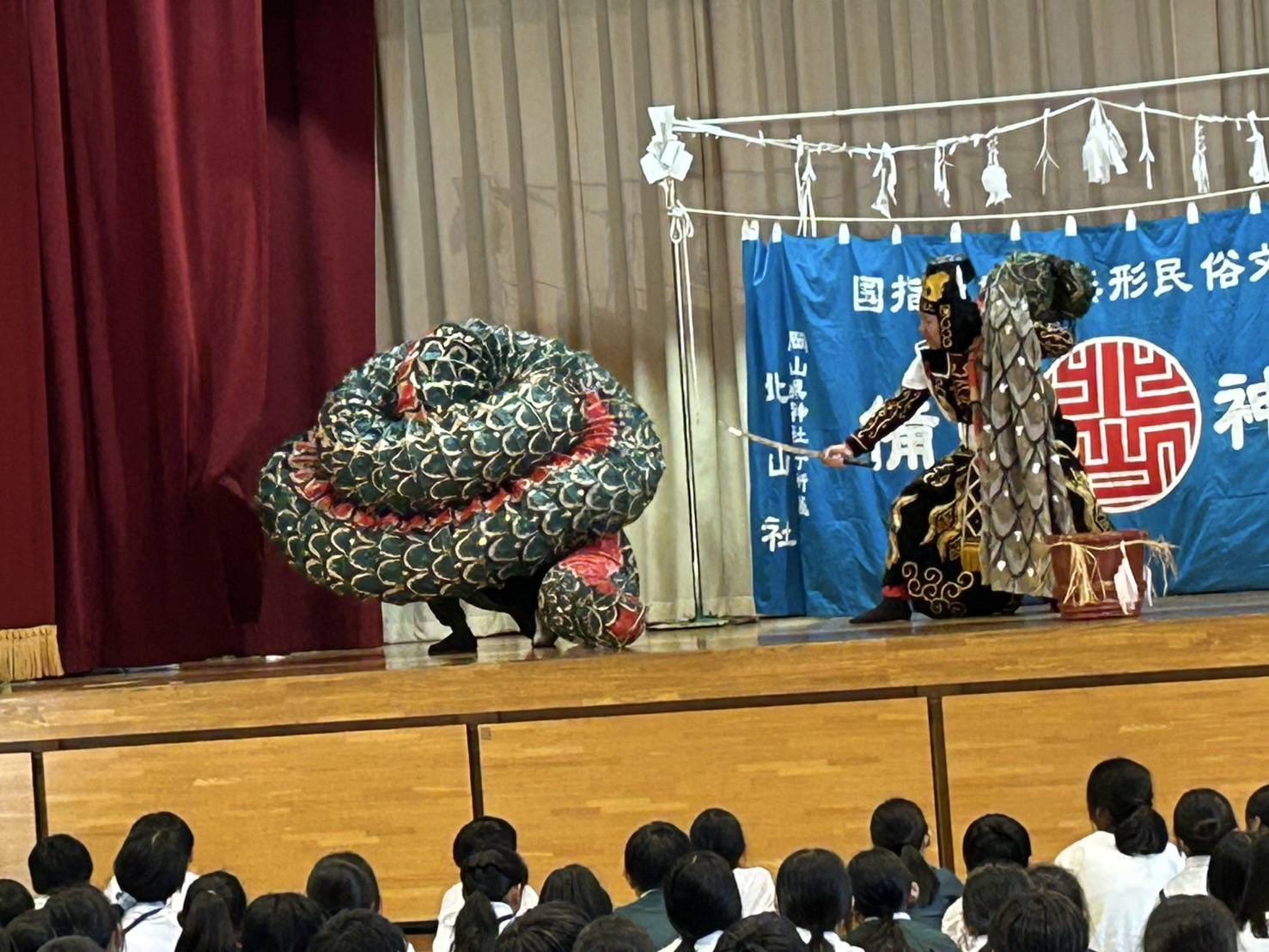 神楽は、神様に奉納する歌舞。演目についての分かりやすい説明により、楽しく観る事が出来ました。児童の皆さんは、興味津々で見入っていた様子でした。また、神話の中にも現代の世の中の情報を織り込みながら、大変興味をそそられる場面もありました。
