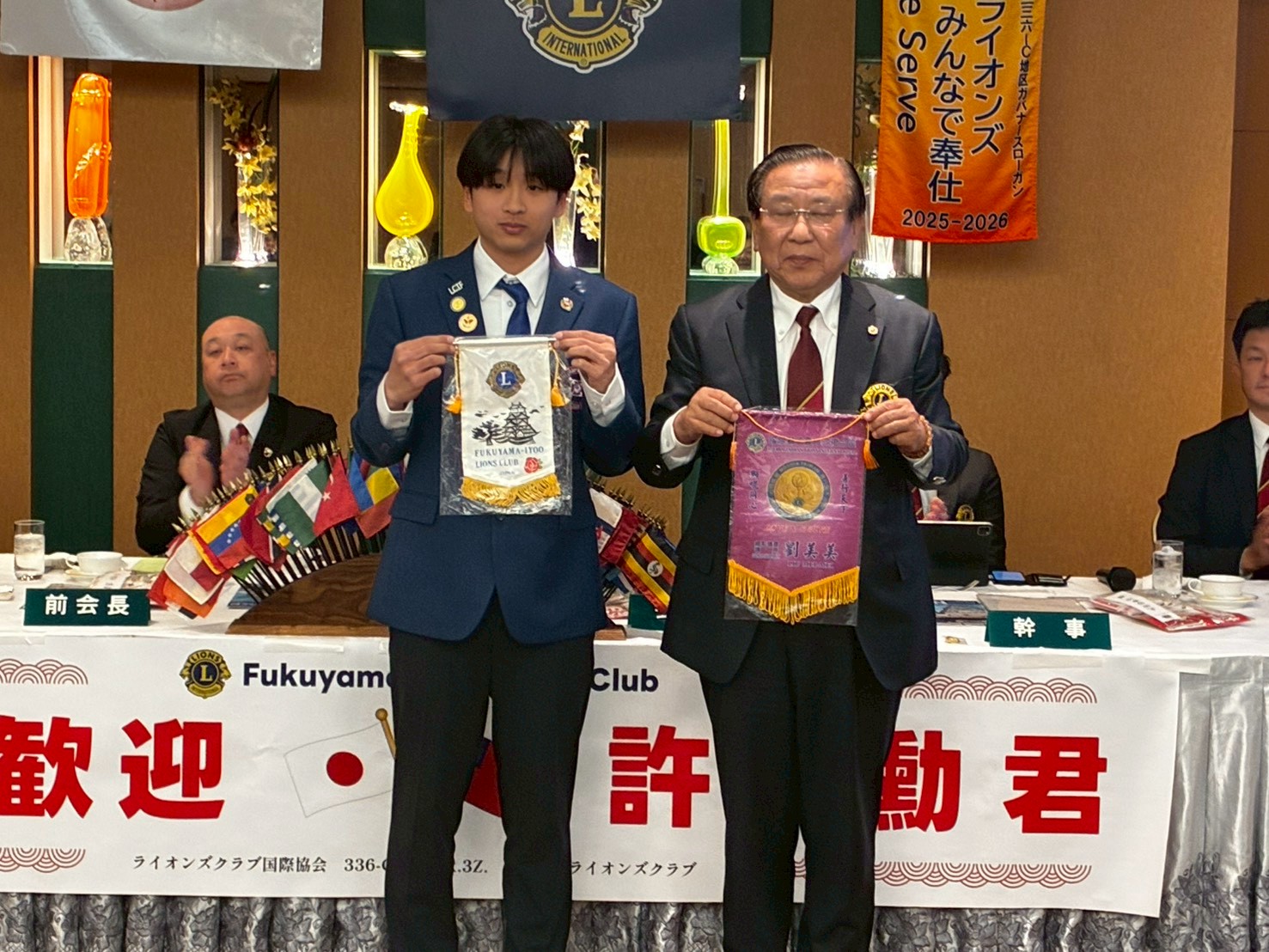 福山ニューキャッスルホテル2F曙の間にて、第1524回例会(2月度第1例会)指名会が開催されました。本日は、広島県赤十字血液センター福山出張所事業部の佐々木稔様をゲストとしてお招きし、3.14(土)に実施する当クラブの献血事業について動画上映も交えご説明頂きました。また、TAIPEI DIAN FAN LIONS CLUB会員ご子息でありYCE冬季受入生の許祐勲(HSU YU-HSUN)さんにもゲストとしてお越し頂き、ご挨拶頂きました。そのほか、元ガバナーを称える月として髙田健司地区名誉顧問への花束の贈呈や、次年度クラブ役員理事指名会、2月にお誕生日を迎えられる方のお祝いなどが行われました。