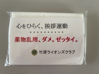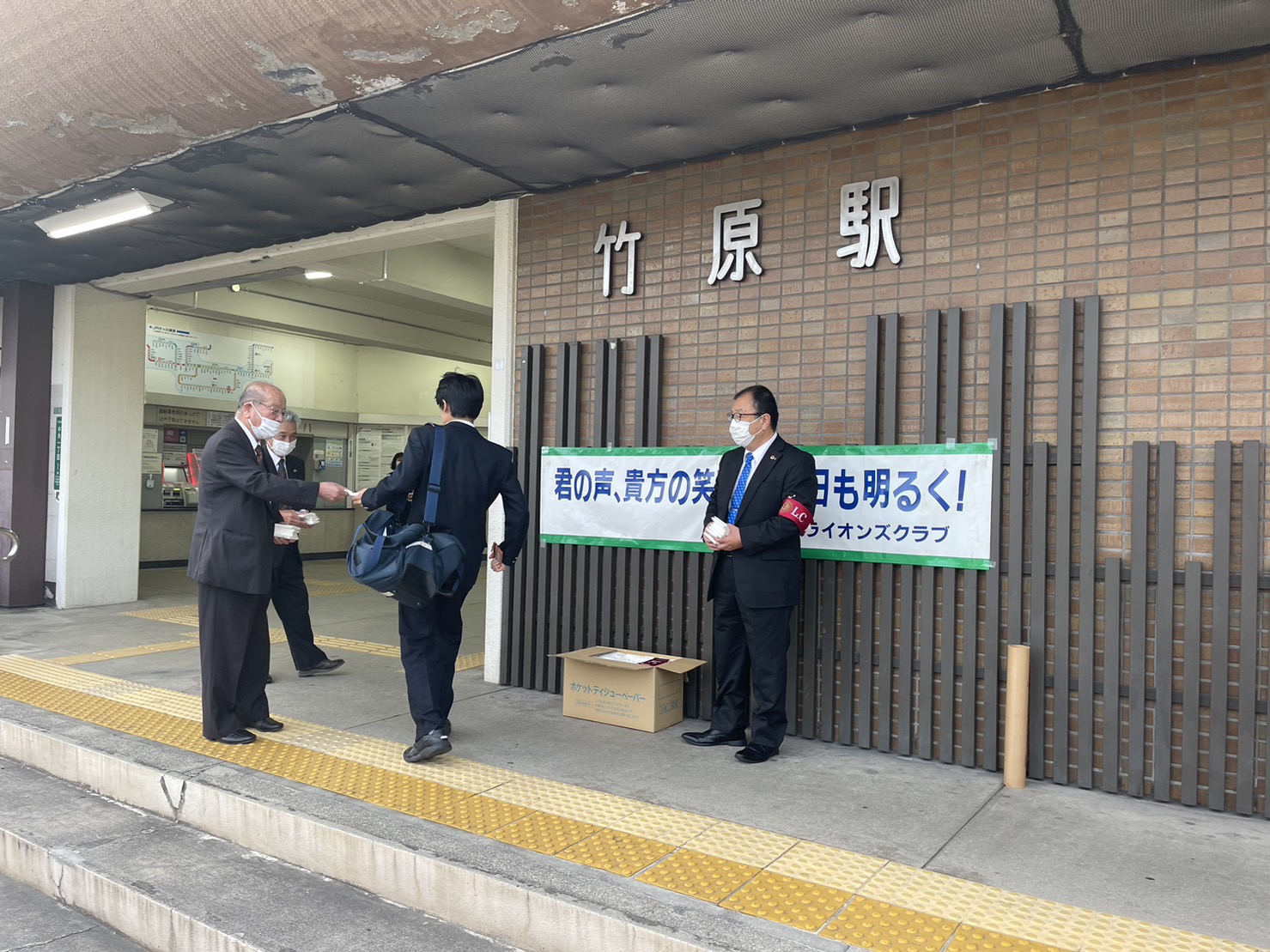 当日6時45分に竹原駅と忠海駅にそれぞれ4名ずつの会員が集合し、通勤通学で駅を利用される市民の皆さんへポケットティッシュを配布しながら挨拶運動を行いました。