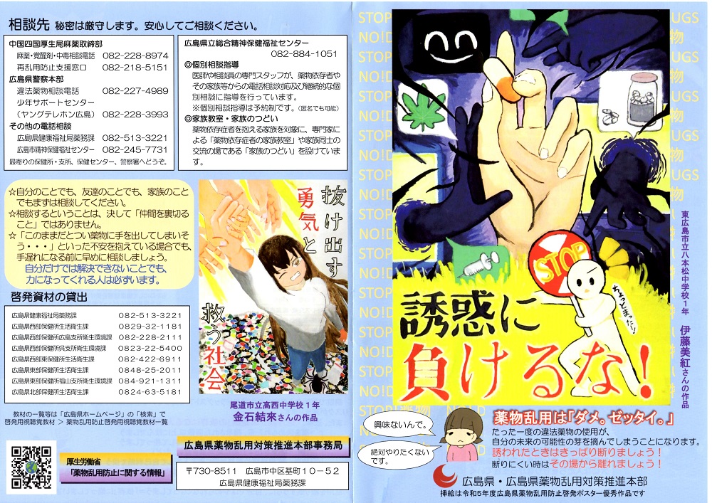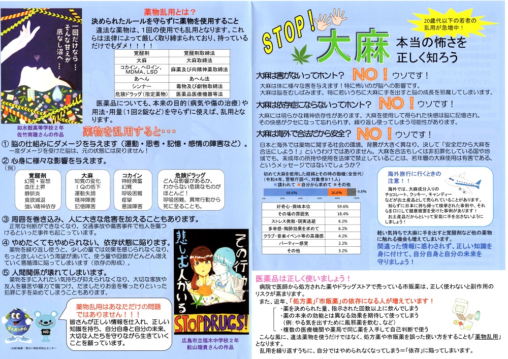 10月8日ライオンズデーを機に広島県の生徒の作品の載ったリーフレットを近隣の二中学全生徒と4小学校6年生に学校での薬物乱用ダメゼッタイの授業で使用してもらうように依頼し配付しています。薬物も脱法ハーブも恐ろしいことが伝ってほしいです。