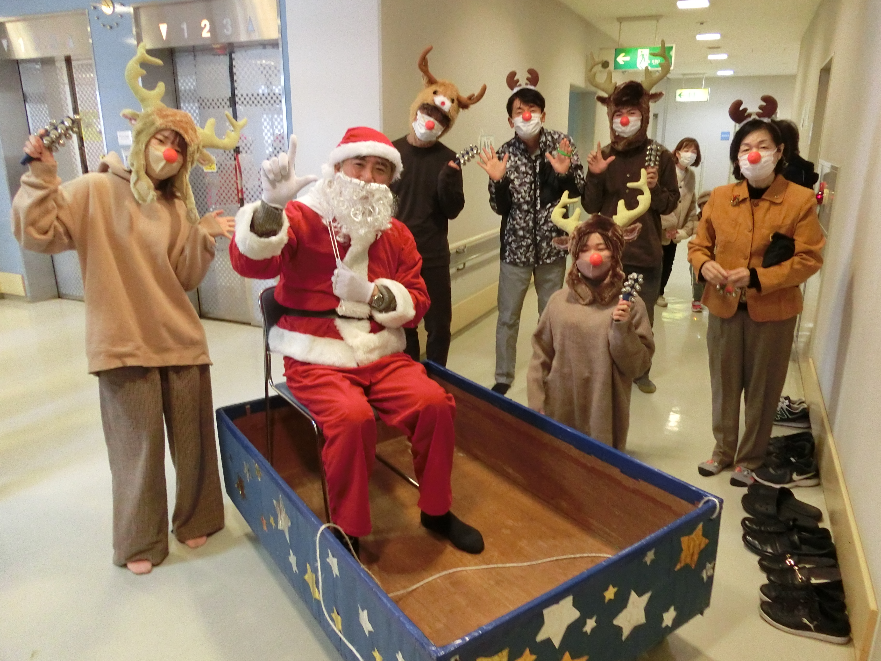 12月25日(月)に児童福祉施設である広島市北部こども療育センターのクリスマス会に学生会員3名を含むメンバー7名で参加しました。父兄のダンスや色々な出し物の後、メンバー2名がサンタクロースに扮して園児全員にクリスマスプレゼントの絵本を手渡しで配り、とても楽しいクリスマス会となりました。