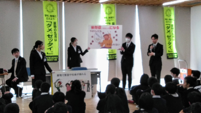 1月29日(月)、広島県西部に位置する大野西小学校にて、広島フェニックスライオンズクラブ主催のダメゼッタイ教室(薬物乱用防止教室)が開催されました。L横路からお声掛けをいただき、昨年3月にオーストリア・ウィーンにて開催された国連麻薬事務局・麻薬委員会のユースフォーラム・サイドイベントに参加した、広島県ヤング指導員の西沖魁晟さんが講師を務めました。西沖さんは広島紅葉ライオンズクラブの学生会員で、比治山大学4年生です。同じく学生会員の比治山大学1年生・大地花凛さん、谷川果乃子さん、広島文化学園大学1年生の倉田将杜さんがアシスタントを務めました。教室には、6年生約110名がご参加下さいました。L横路からのレクチャーとリハーサルをはじめ、フェニックスの皆様には大変お世話になりました。学生会員の皆は、次回の開催を楽しみにしています。クラブの垣根を超え、リジョンを超え、一緒に同じ目的に向かう姿に感動をいたしました。