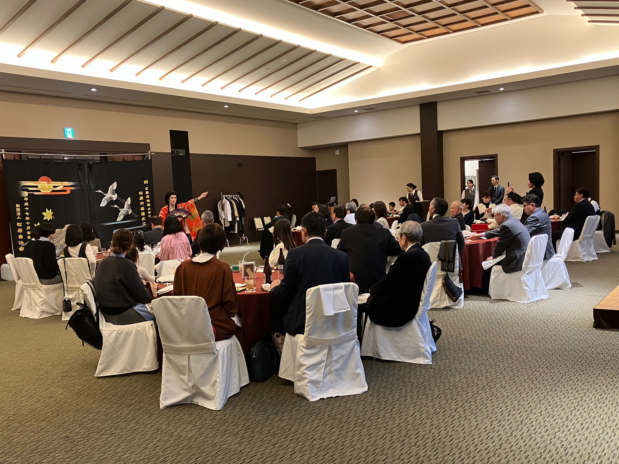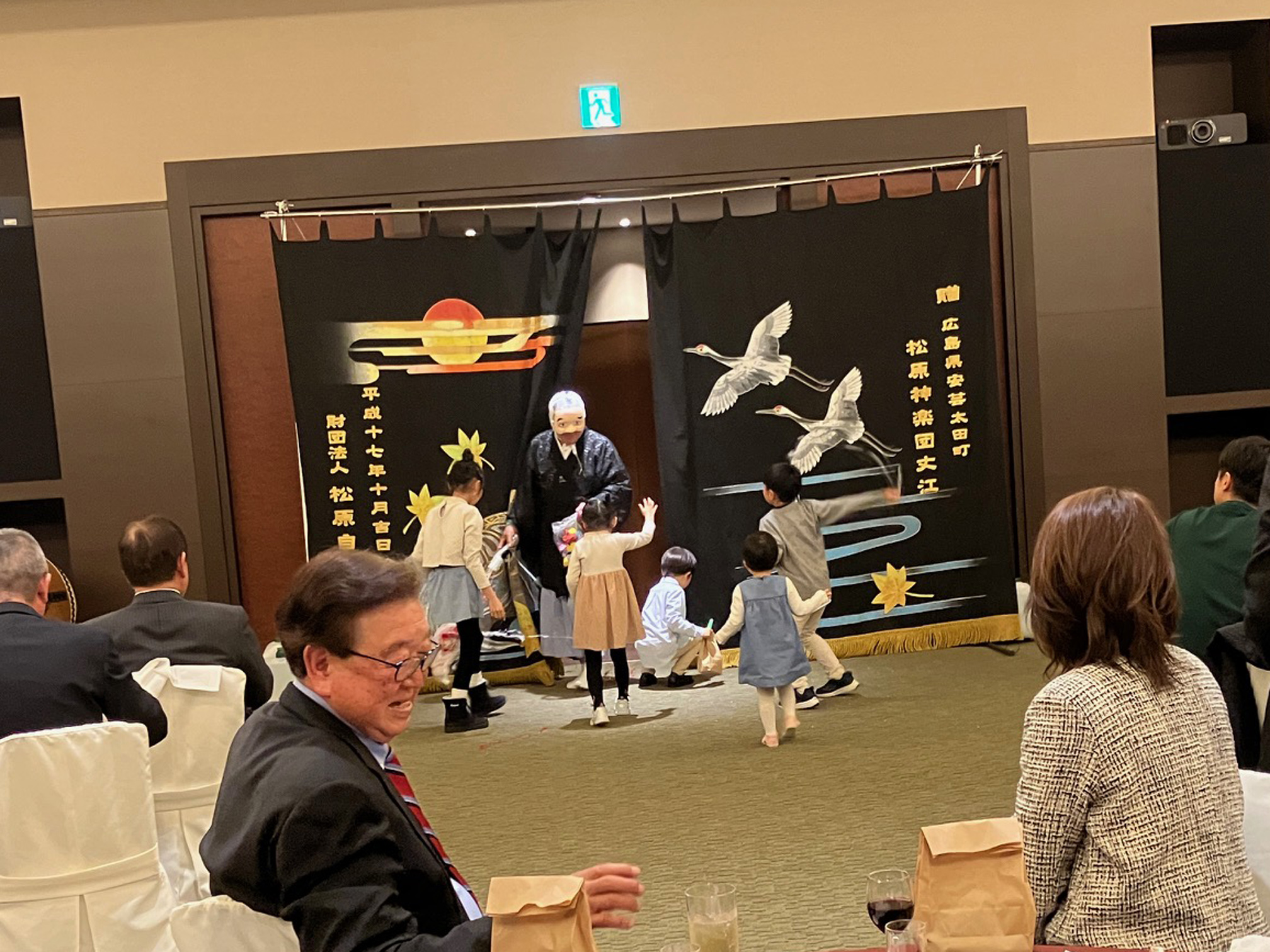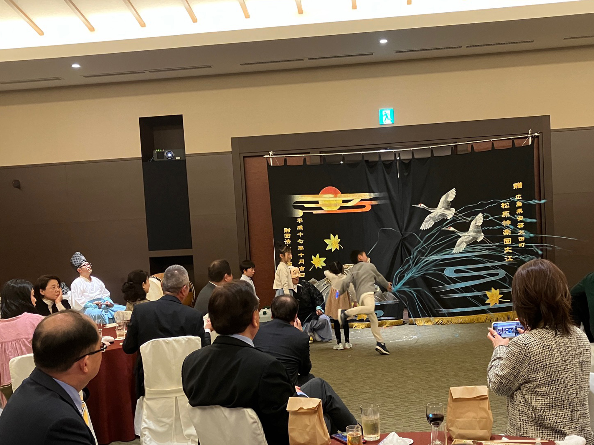 2024年3月24日(日)、17時~、料亭二葉で第991回広島フェニックスLC例会及び2024お花見家族例会懇親会を開催し、ライオンズファミリーのみなさんと楽しい時間を共に過ごしました。石井さんプロデュースの美味しい料理と松原神楽団『悪狐伝』に、大盛り上がりでした。子どもたちは、神楽に興味津々で、演者のすぐ前に陣取り、観ていました。また、クモの糸を投げるパフォーマンスに興じていました。計画委員会のみなさん、神楽、抽選会と盛りだくさんの企画をありがとうございました。