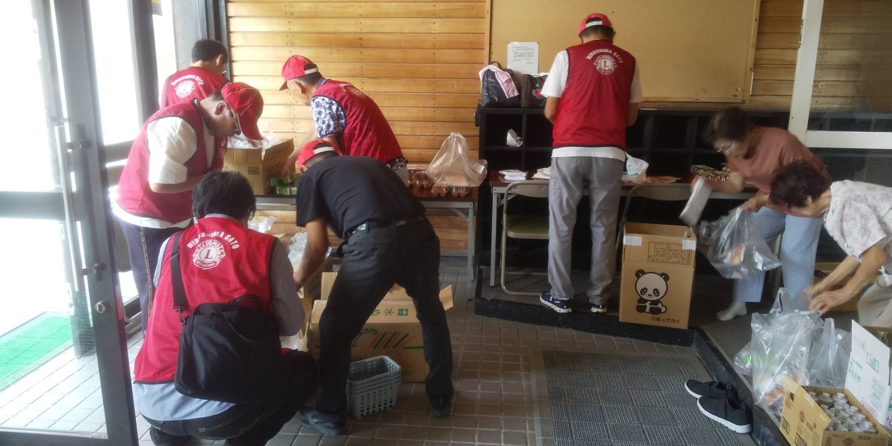 会場作りから記念品を詰め合わせ作業。そこに糖尿病防止チラシを入れています