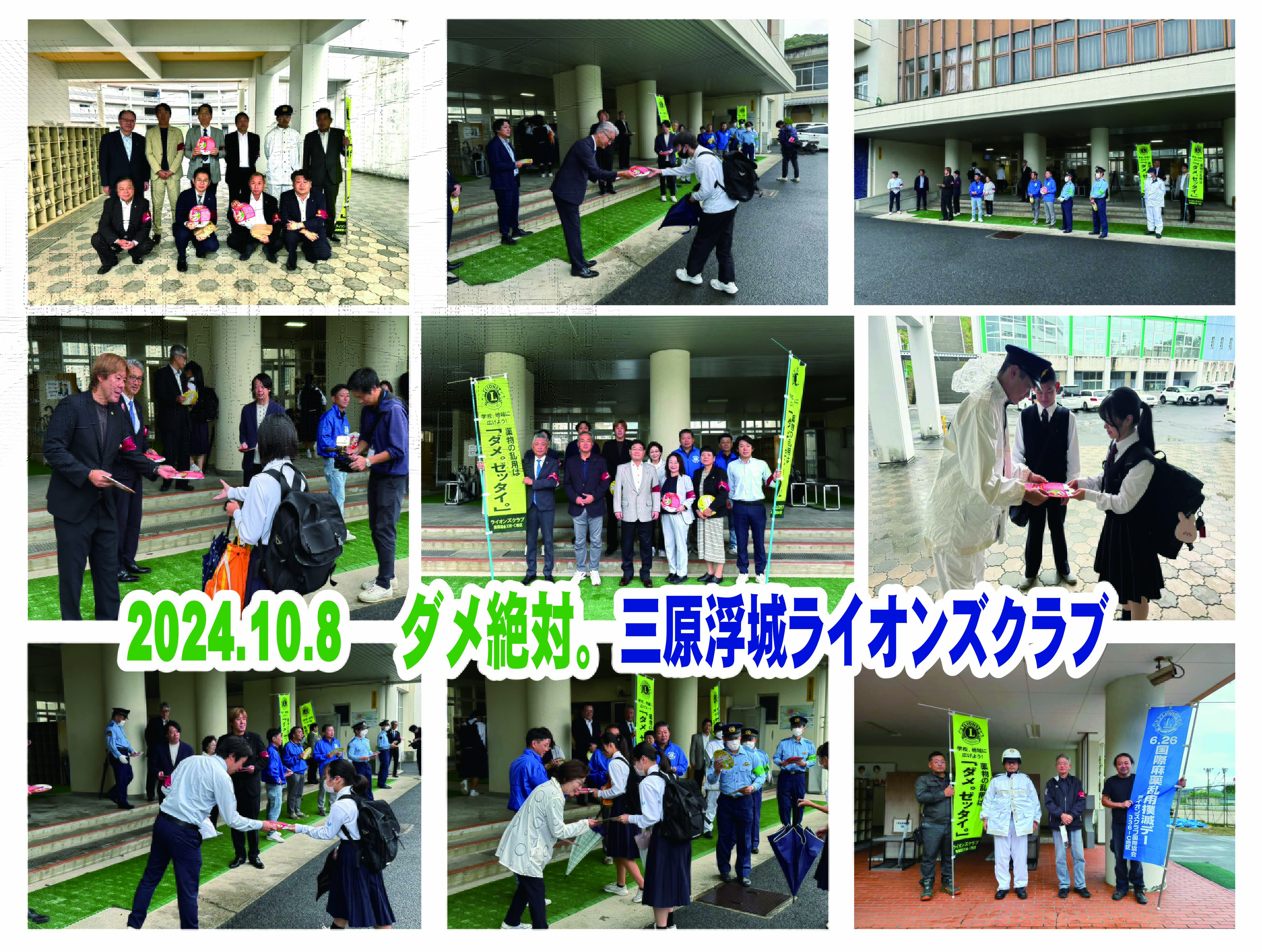 10月8日の世界ライオンズデーに伴い、クラブでは三原市内の中学校、高校で「ダメ、ゼッタイ!」をスローガンとした校門前でのビラ(うちわ)配りを行いました。