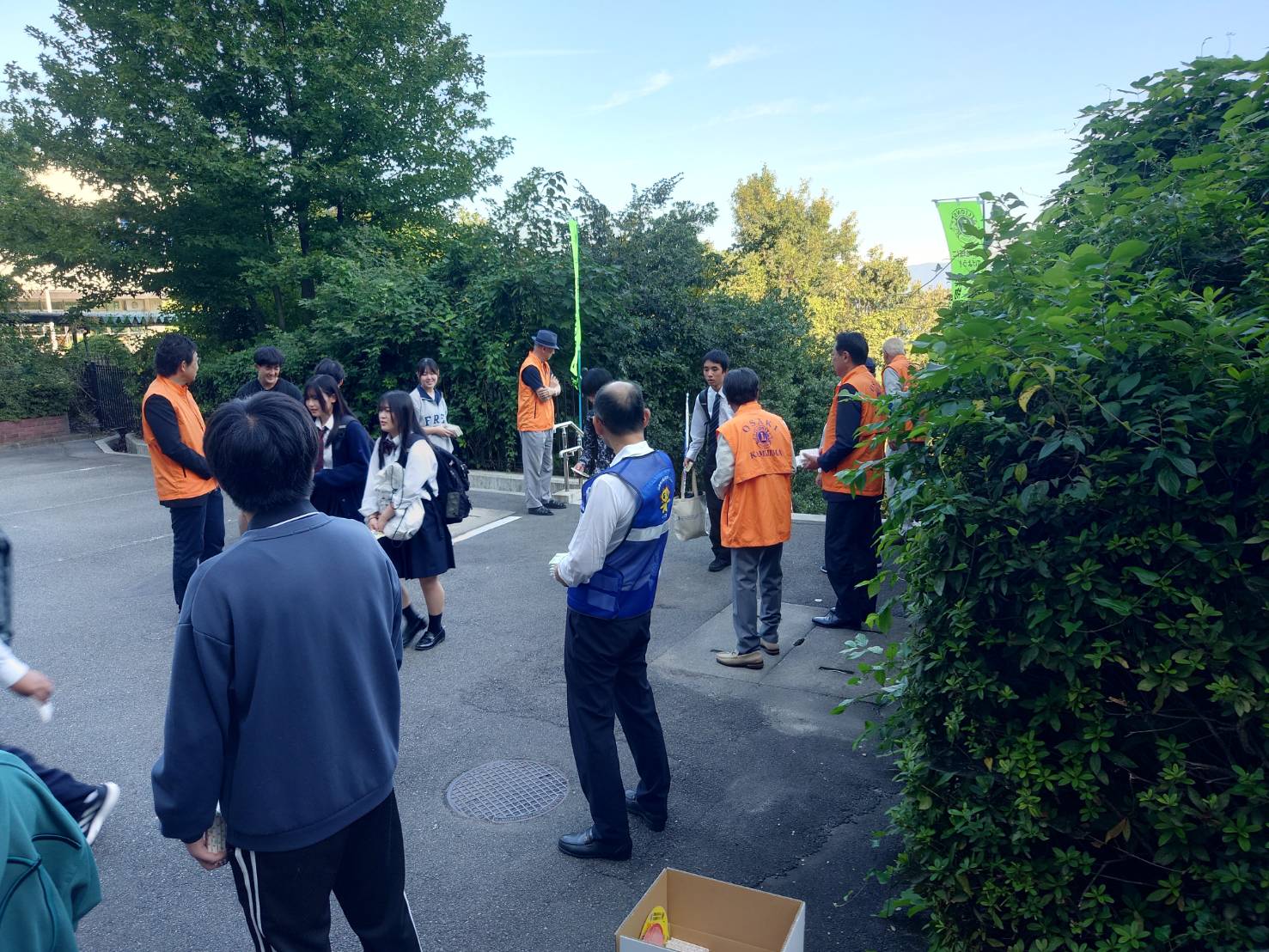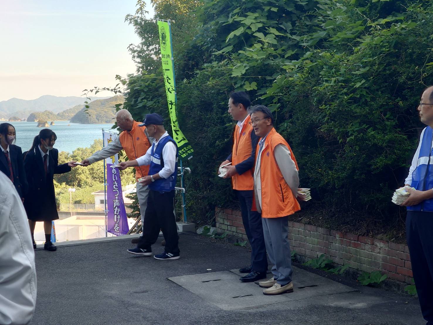 登校中の生徒約500名に、薬物乱用防止のビラを付けたティシュを配布しました。