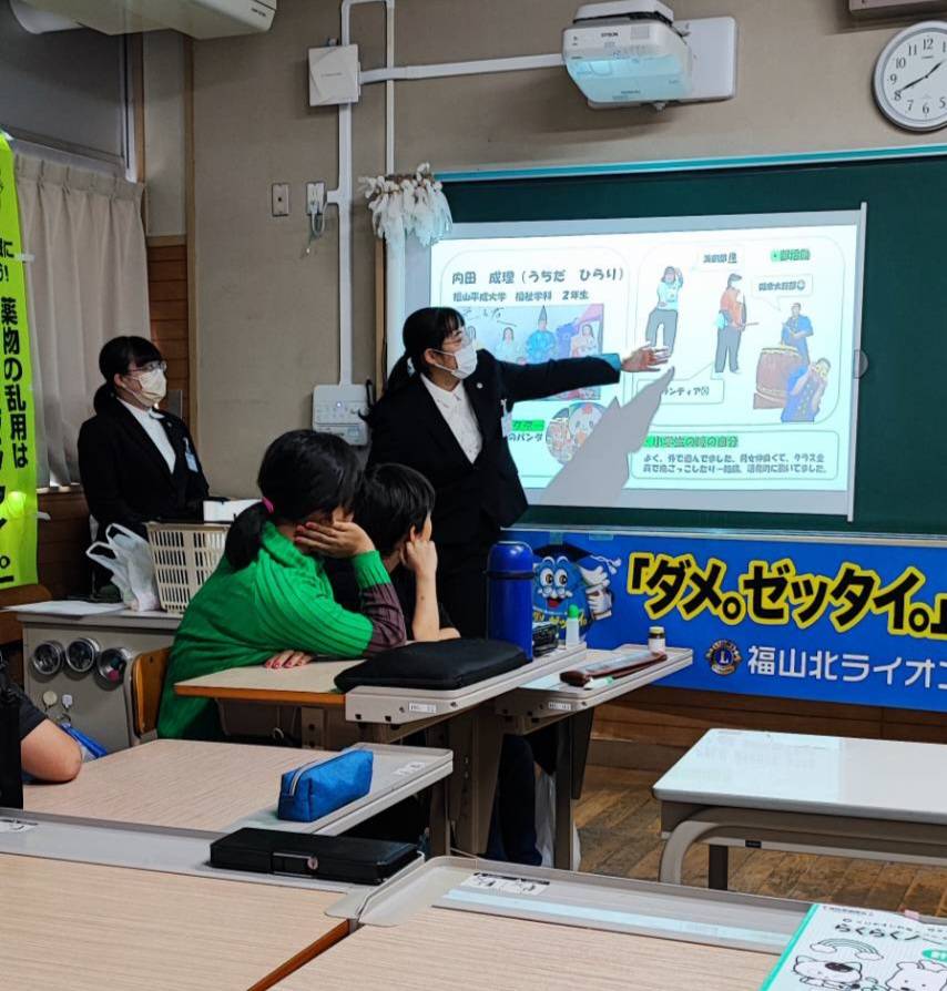 2024年10月24日(木)福山市立広瀬学園にて薬物乱用防止教室を開催しました。講師は今年度薬物乱用防止認定講師養成講座を受講した福山平成大学の学生2名。