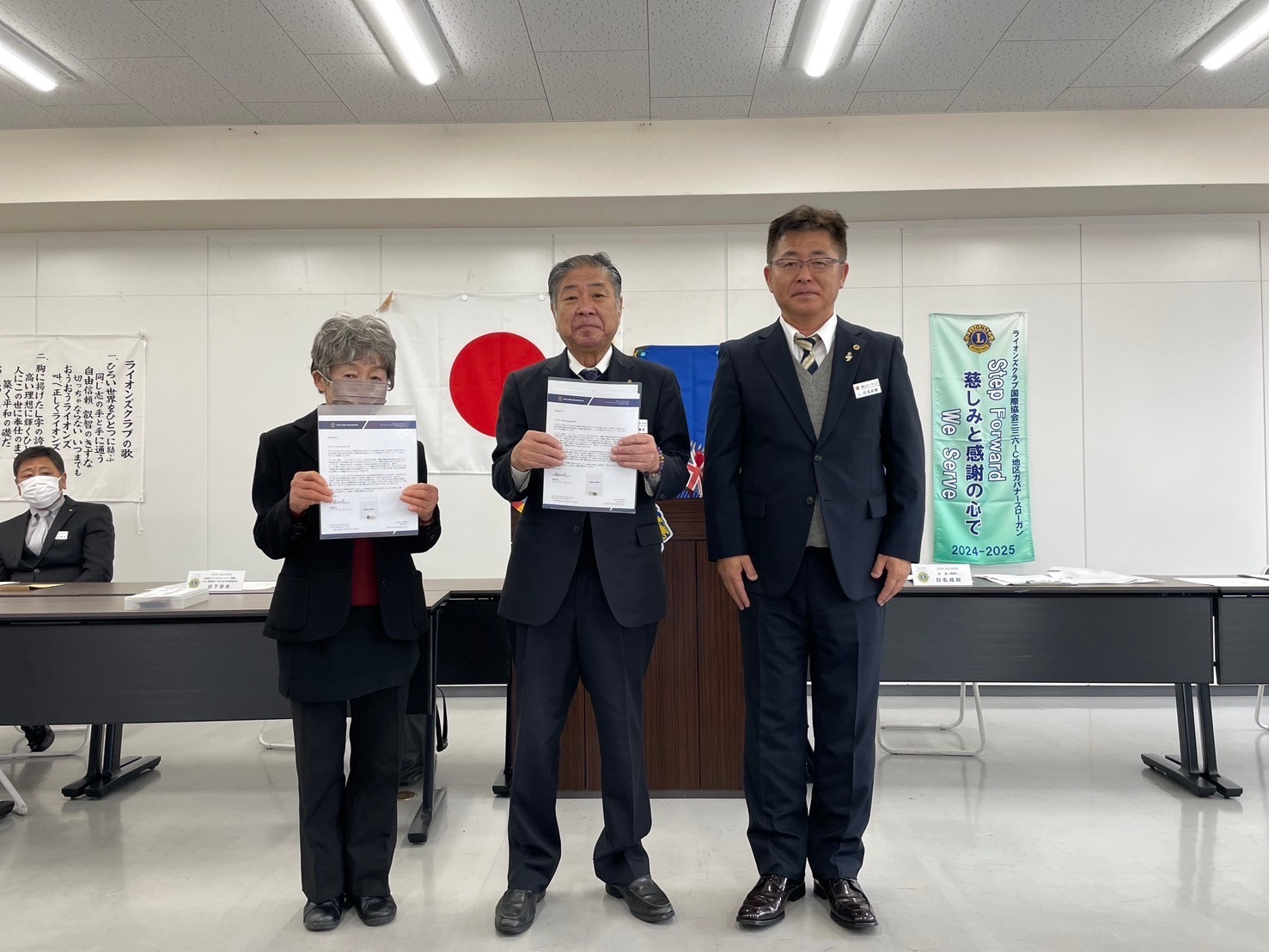 そのあと、会員の平櫛さん、杉野さんの2名にマイルストーン・シェブロン・アワード(ライオンになって20年)の贈呈をさせていただきました。
