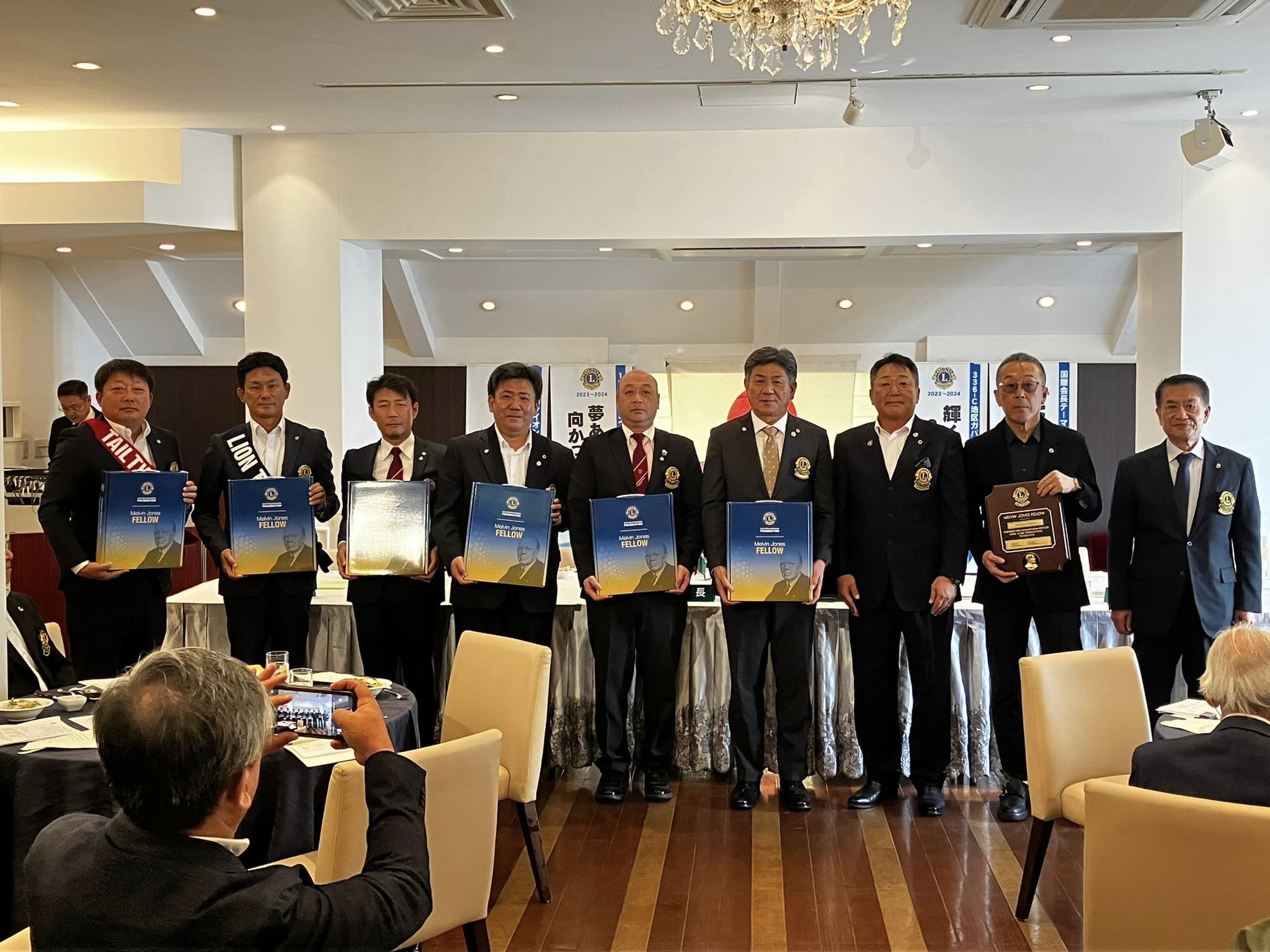 本日は、当クラブ計15名のMJF(メルビン・ジョーンズ・フェロー)献金者へ、髙田健司地区名誉顧問より、MJF楯並びにLCIFライオンズ・サポーターピンの贈呈が執り行われました。