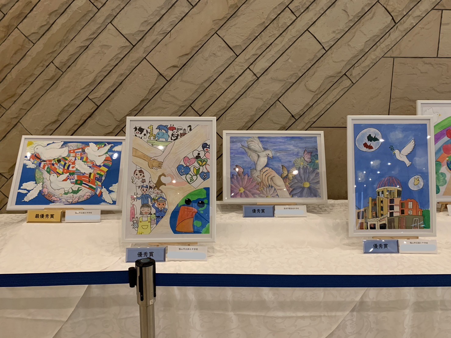 平和に対する夢や希望、構造や色彩、独創性などを考慮し、会員の投票により選出された最優秀賞1点、優秀賞3点、入賞6点を福山ニューキャッスルホテル様のご協力により1階ロビーへ展示させていただきました。