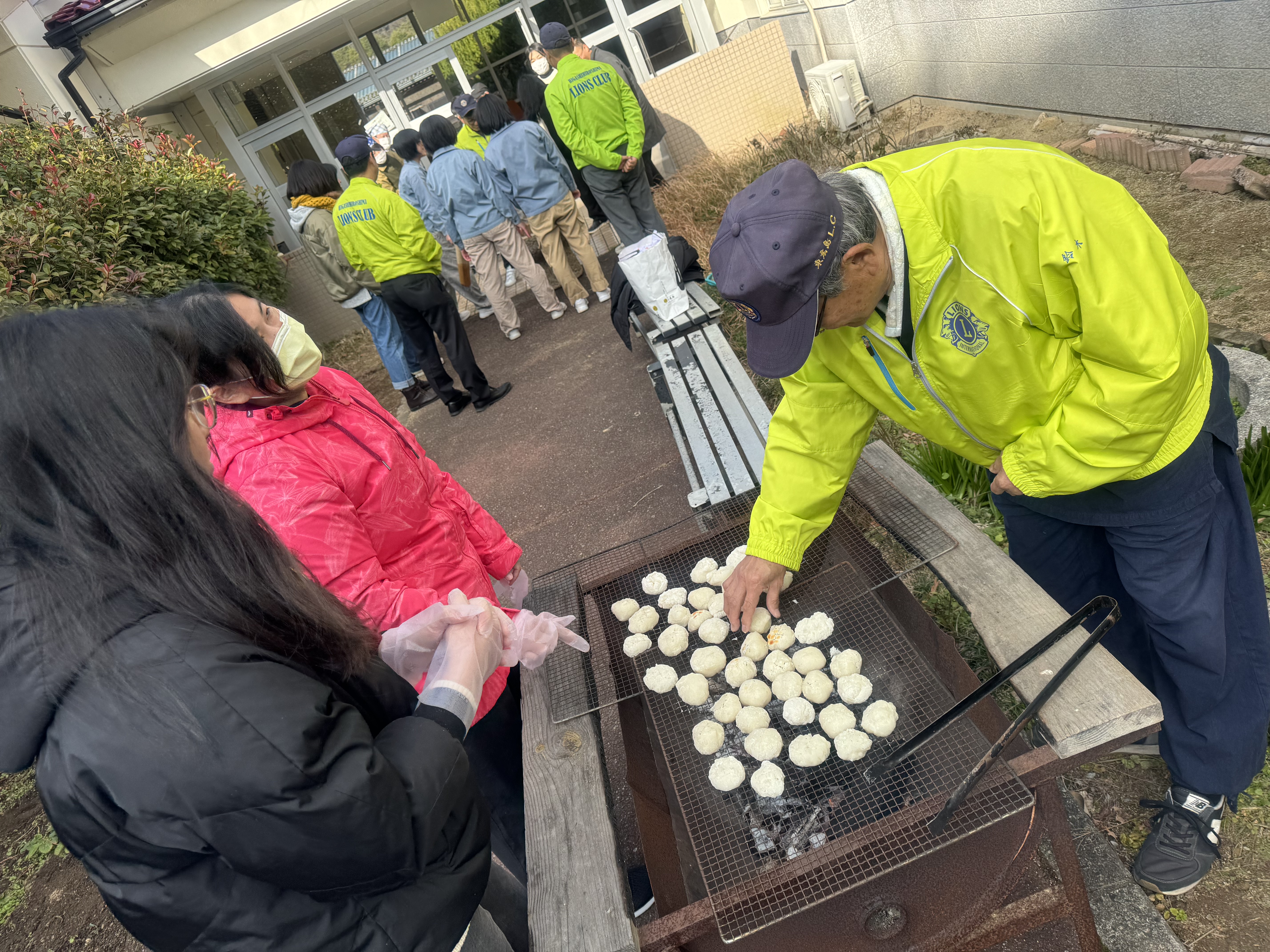 餅つき後は、ついたお餅を焼いてご用意いただいた豚汁に入れて