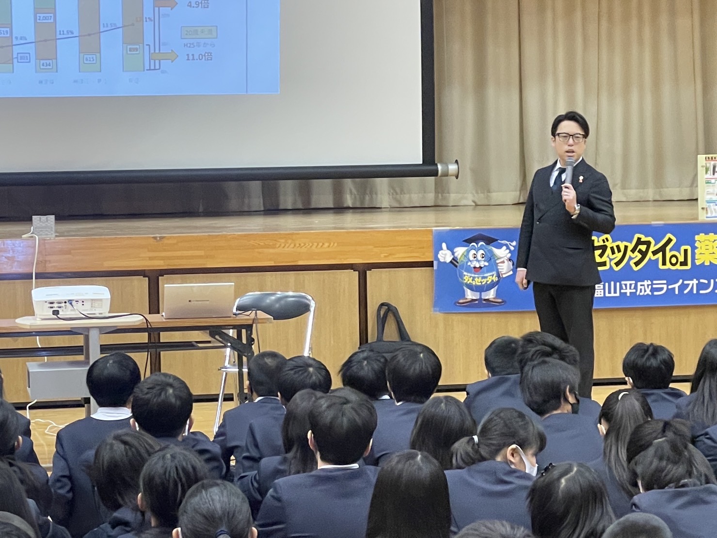 今年度7校目の薬物乱用防止教室です。6年生135名を対象に薬物乱用のDVDの映像・〇×テスト・寸劇を交え児童達は真剣な眼差しで聞き入り、薬物の恐ろしさ正しい知識を学び、たとえ薬物に誘われたとしても「ダメ絶対!!」と断る勇気を身に着けてくれたと思われます。今回の講師はデビュー戦でしたが教員より教員らしいとベテランのiさんが絶賛しておりました。