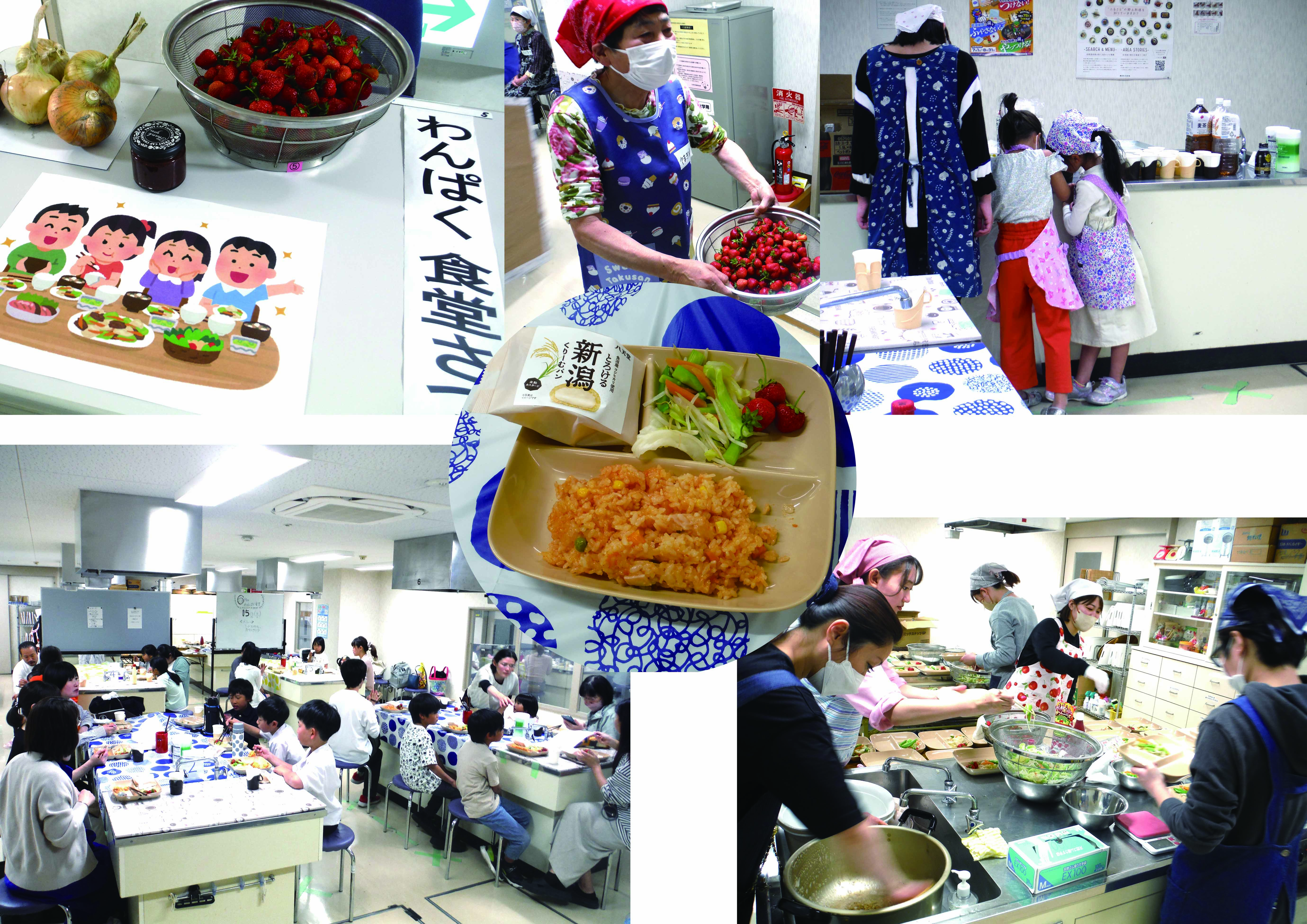 メニューは、さつき支部が畑で育てた苺、チキンライス、サラダ、八天堂さんからご提供いただいたクリームパンなどなど